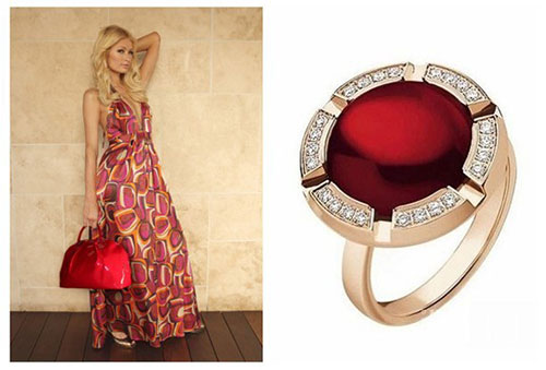 本款包搭配Chaumet度假珠宝的Class One Croisiere红榴石系列更显高贵迷人。此款珠宝以18K粉红金制成,镶以圆形切割之美钻和1颗圆拱形切割之红榴石。时尚、优雅而又神秘的石榴红色,给人一种大气、高贵的感觉,更好的展现女人的妩媚,就如同美丽的落日余晖,给人以温暖的力量。