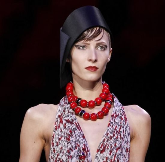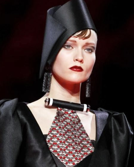 Armani Privé这一季大走民族风,缎带帽已经足够吸睛,帽子下的大颗水晶和宝石耳环更是夺人眼球。