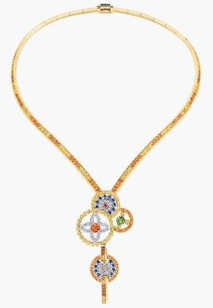 Louis Vuitton喜欢将所有珠宝设计都打上旅行与探险的烙印,这次的部落风格珠宝也不例外,此次的珠宝系列带领我们游历了东非,尤其是偏爱多彩串珠饰品的马塞部落。它推出的Tribal Ornament系列灵感就来源于东非肯尼亚的马塞族部落饰品。锰铝榴石、多彩蓝宝石、芒达兰石榴石和新奇的钻石取代了呆板的珠子,品牌标志性的花朵与星星图案也被纳入设计之中。大胆的撞色与民族图案使之成为21世纪的一次视觉挑战。而黄金的链条则表明只有黄金的尊贵与气势才能衬托彩色宝石的绚丽耀眼,才能承载纱丽的华美繁复。