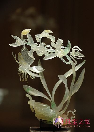 罕见的三彩翡翠水石,质地细腻,明莹洁净。兰叶上的脉络纹理,纤毫毕现。