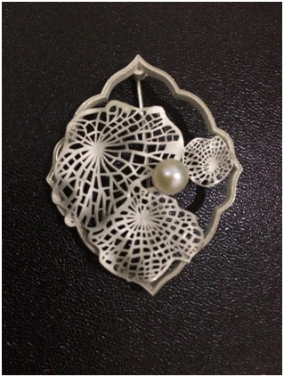 就我个人品牌倪尚主题产品杭州西湖主题系列“风荷”首饰(图3)(图4),基于江南地域文化的特点,以荷叶荷花为灵感,以写实雕塑手法再现荷叶的婀娜多姿,采用立体透雕和镂空表现手法。荷叶的经脉被解构成疏密有致的格子状,随意放松而细腻,卷曲的荷叶仿佛随风摇曳,赋予冰冷的银片以柔软的感觉;强调抽象与具象的交融,突出东方的意境美。让人联想中国画笔下的妙笔生花,栩栩再现荷花的风姿,使首饰视觉上既轻松写意,又不乏精致优美。