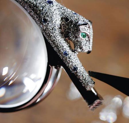 各色缤纷的刚玉、红宝石、璀璨的钻石或不正规钻石,变幻为卡地亚标志性的猎豹图案,争相在两侧的镜架上大放异彩。卡地亚遇上宝石,就是美丽的秘密。