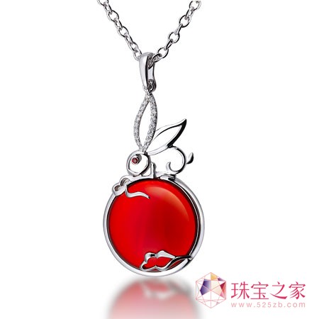 此款项链以玉兔为设计元素,玉兔形态栩栩如生,举头望远,若有所思。红玛瑙圆润如月,充满东方的古典浪漫情怀。寓意心愿圆满,吉祥如意。