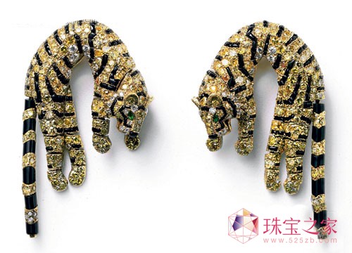 Cartier高级珠宝18K黄金镶彩宝虎形耳钉