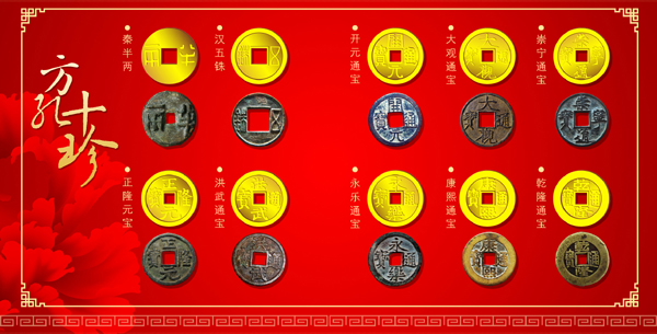 古钱币虽然退出了历史舞台,但作为一种文化载体,却具有永恒的收藏价值,它所包涵的东方哲学思想与审美情趣,永远是认识中国历史文化的一个窗口。在历代古币中,被誉为“方孔十珍”的秦半两、汉五铢、开元通宝、大观通宝、崇宁通宝、正隆元宝、洪武通宝、永乐通宝、康熙通宝、乾隆通宝,无疑极具代表性且占有举足轻重的地位。两千多年来,它们的流通和使用,使得圆形方孔钱的形制基因得以完美遗传和承袭,或是开启了大秦帝国的统一强盛,或是记载了通宝币制的功在千秋,或是镌刻了皇帝御书瘦金体的永世流芳,或是辉映了康乾盛世的兴盛繁华……,一币虽小,却以独特的视角记载了自秦至清的两千年封建盛世的时代风貌与社会政治、经济、文化气息变迁,内蕴乾坤,殊堪品咂玩味。